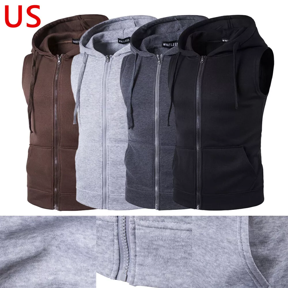 Mens Workout Hooded Tank Tops Gym Sports Training Zip Up Vest Cut Off Hoodies